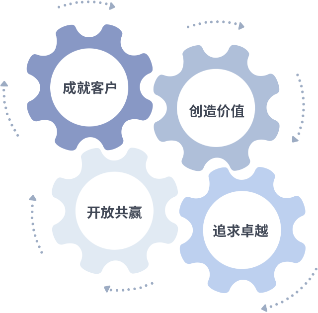 成就客户是一切决策的出发点,创造价值是衡量所有工作的标准,追求卓越是开元国际做事做人的态度,开放共赢是开元国际的格局也是最终的结果。价值观的齿轮环环相扣,推动着组织里的每个人不断向前。